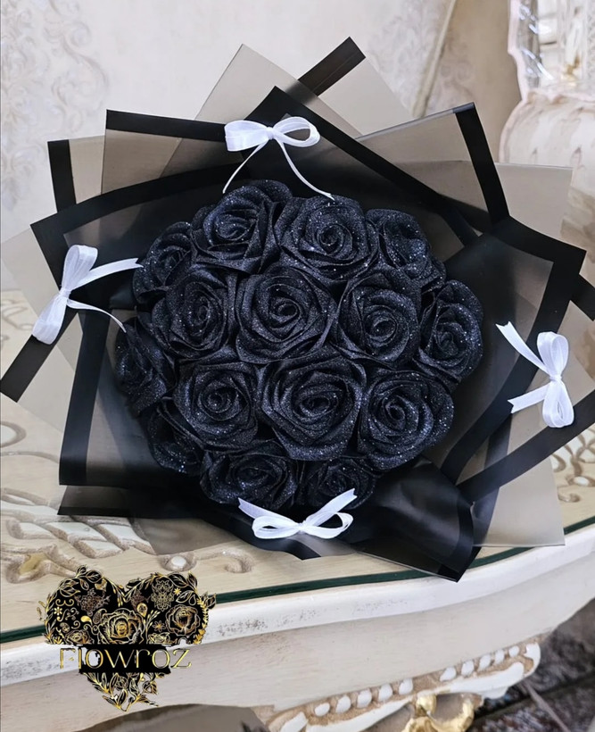 دسته گل مصنوعی رز روبانی ۱۶ شاخه مشکی سوپر شاین