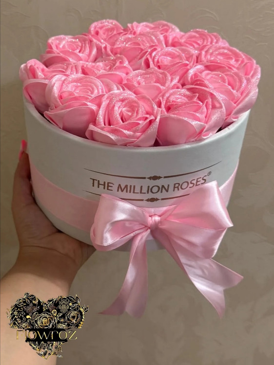 باکس گل مصنوعی رز روبانی ۱۰ شاخه صورتی سوپر شاین